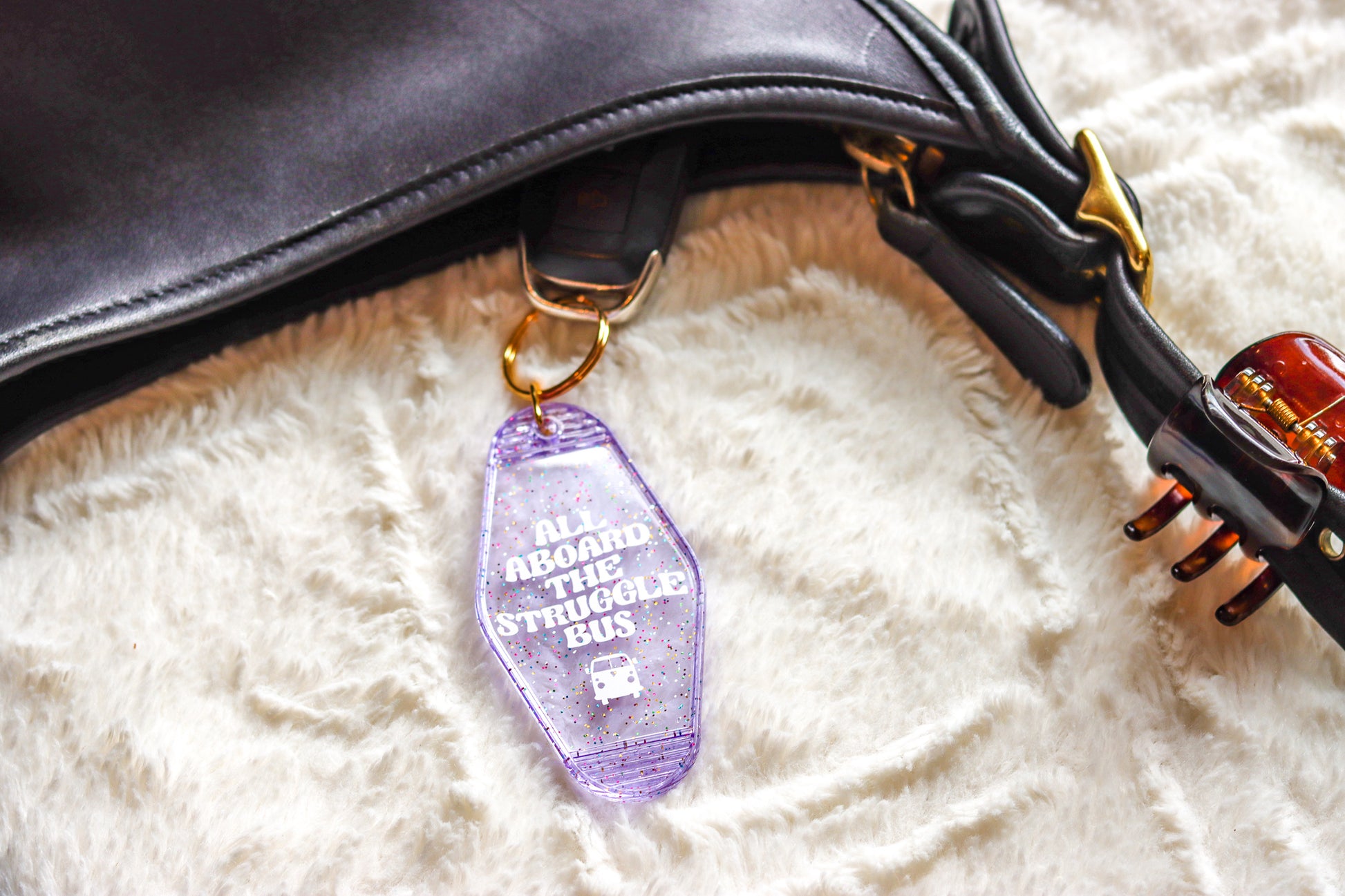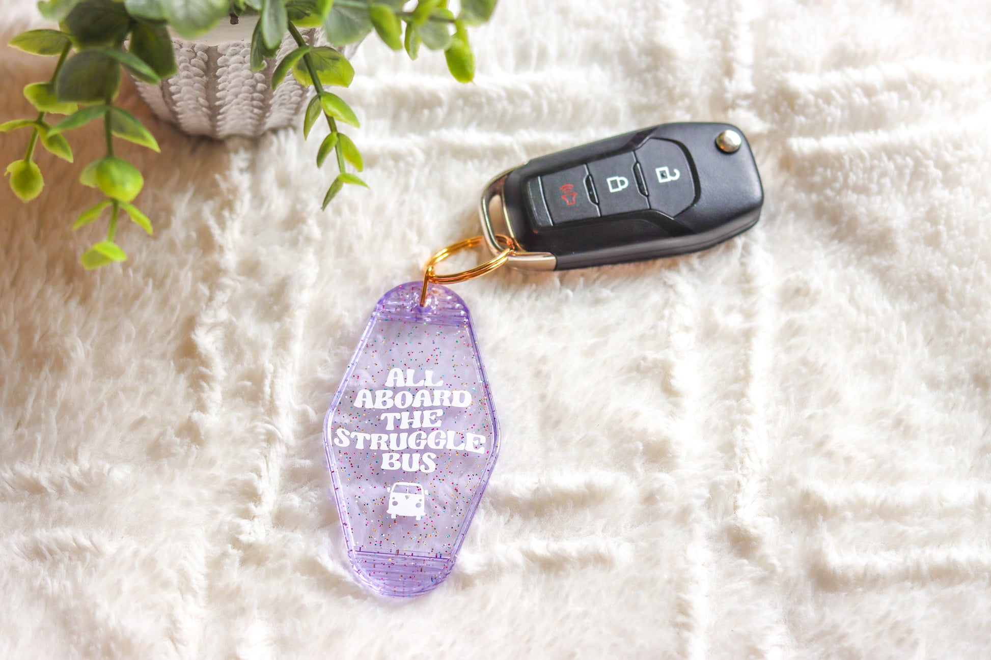 Keychain is a transparent purple with multi color glitter, and white permanent vinyl design.