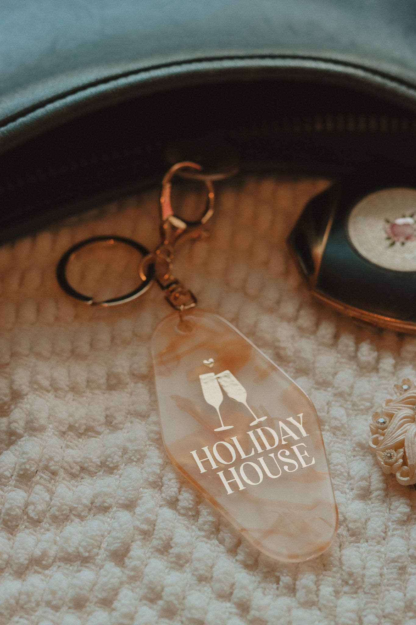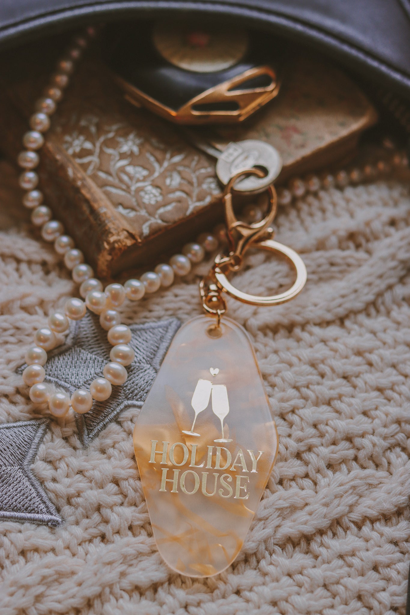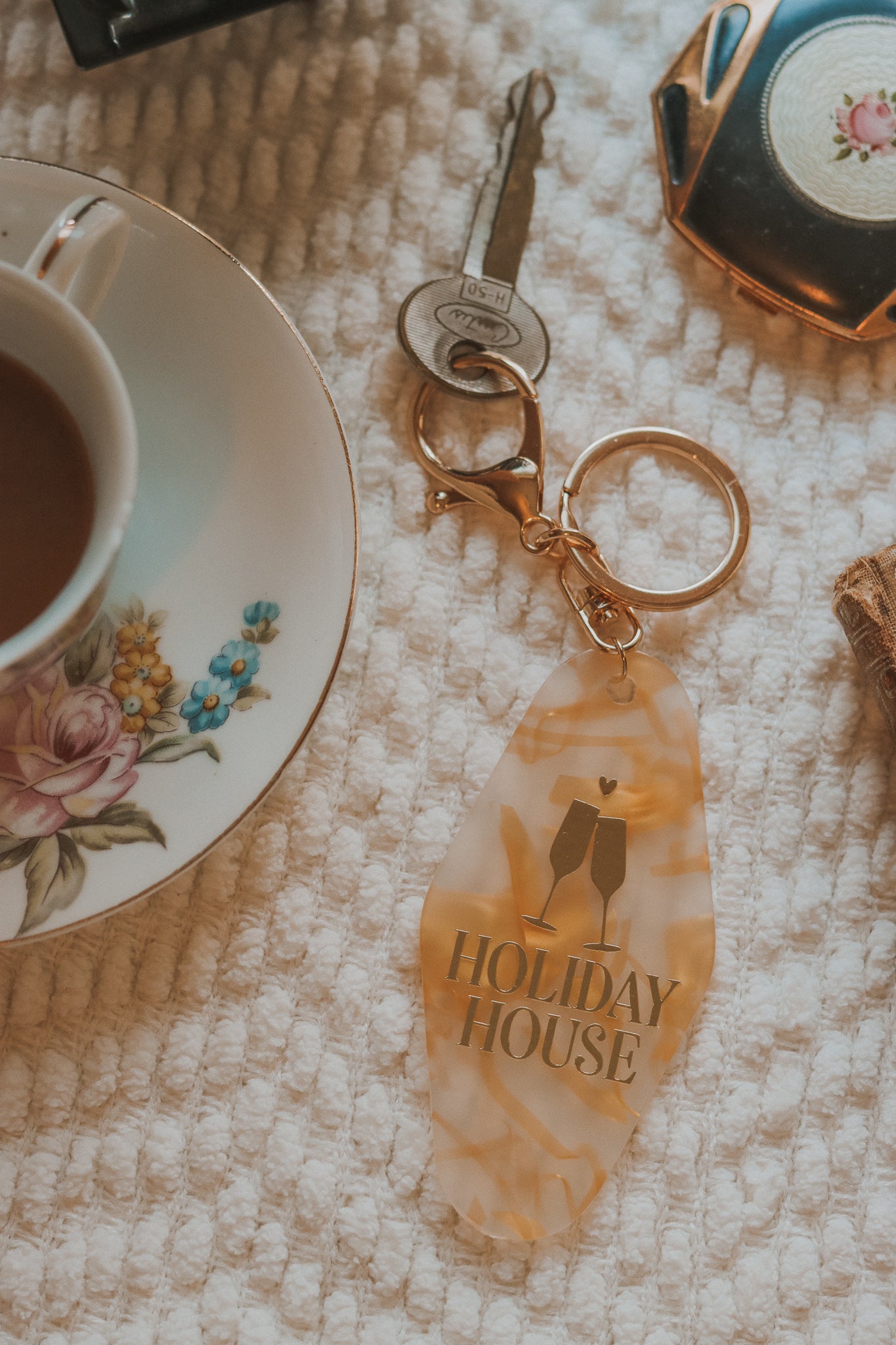 These luxe motel style keychains are a marbled gold red with gold design, and gold hardware. Keychain measures 3.5" x 1.5" (Not including hardware).