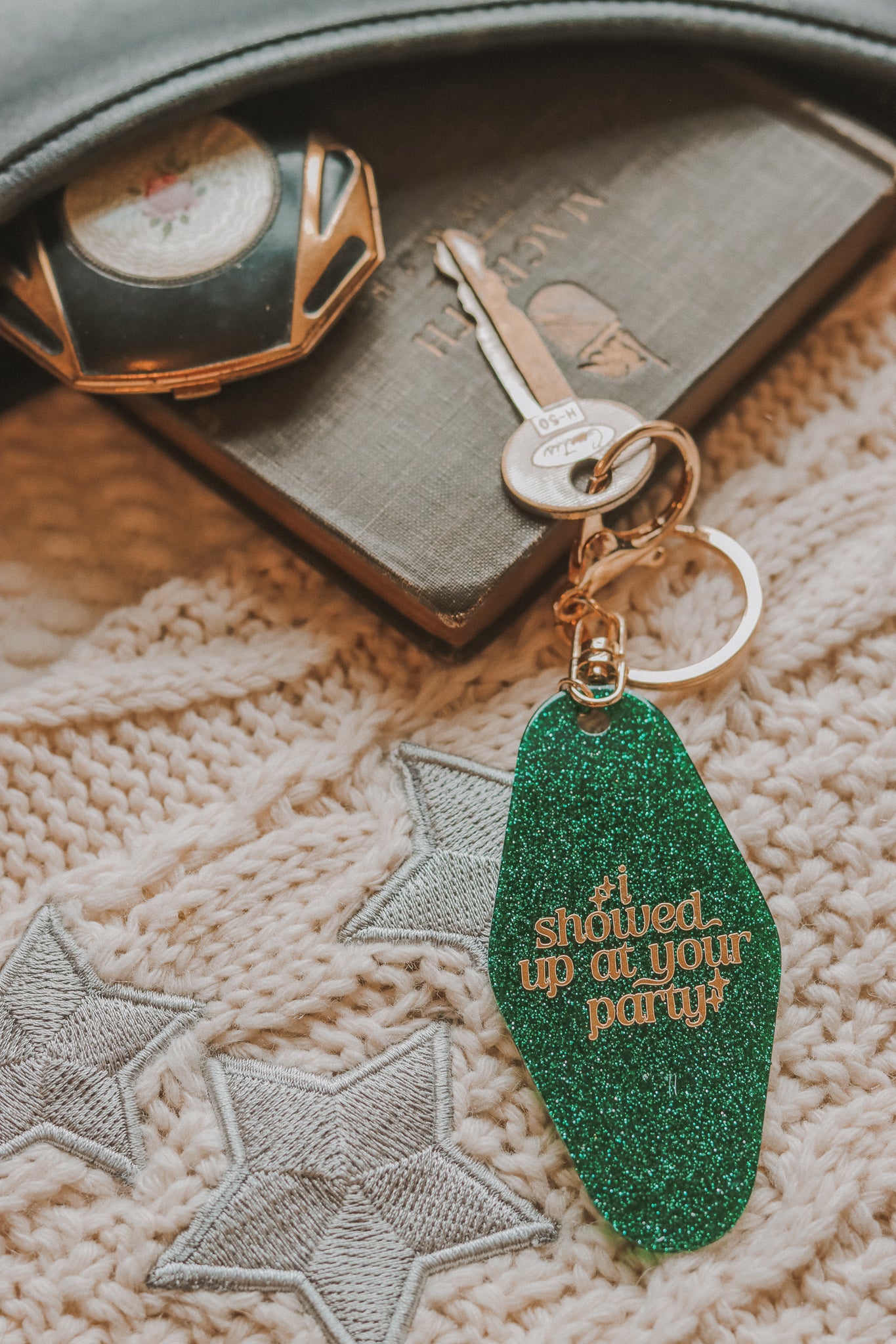 These luxe motel style keychains are available in light green sparkle or dark green sparkle with gold design, and gold hardware. Keychain measures 3.5" x 1.5" (Not including hardware).