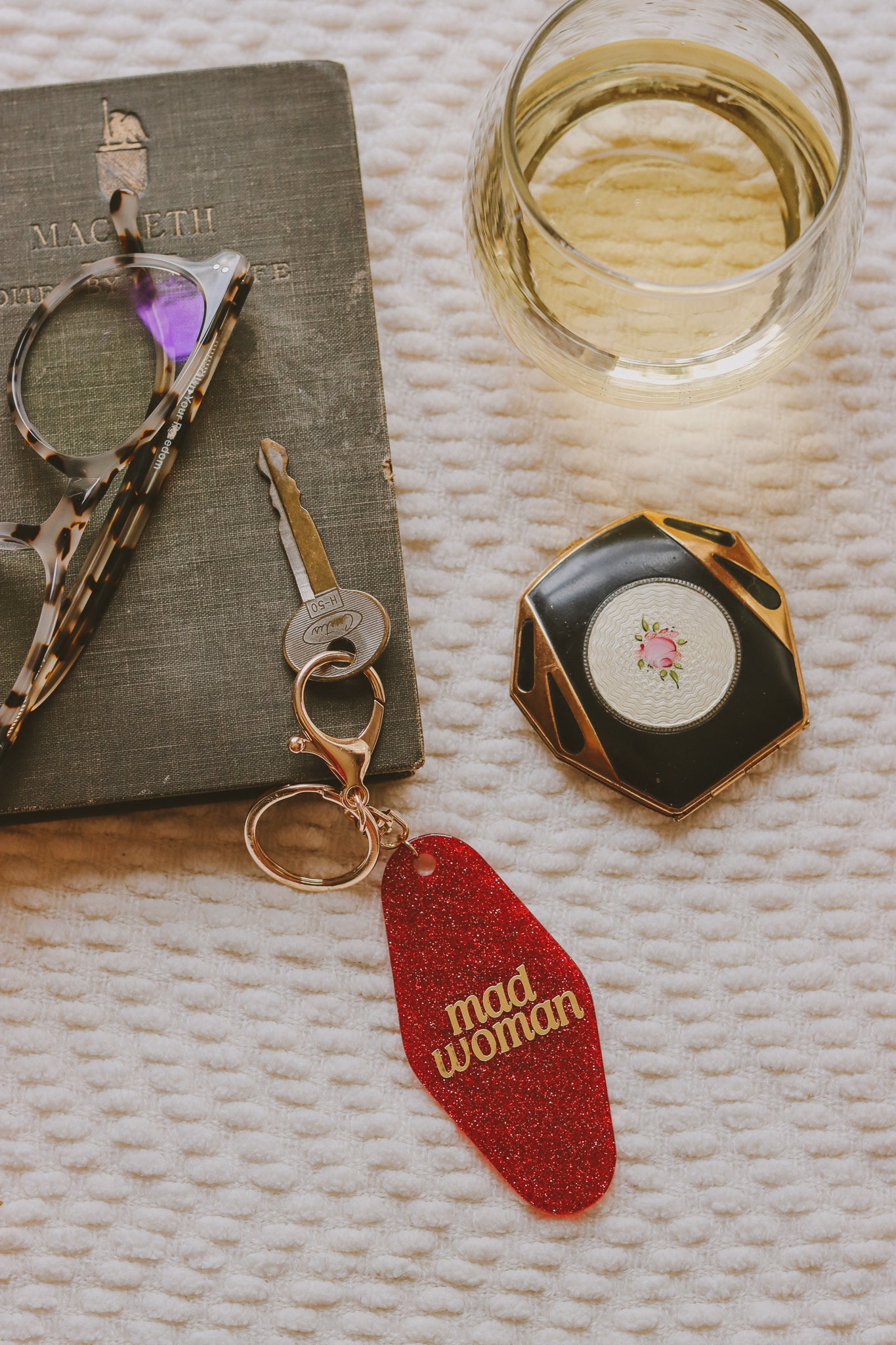 These luxe motel style keychains are a sparkle dark red with gold design, and gold hardware. Keychain measures 3.5" x 1.5" (Not including hardware).